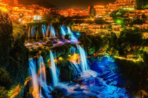 随着一阵雄浑的鼓声在湘西自治州永顺县芙蓉镇大瀑布旁响起,大型原创行浸式实景民族风俗演艺《花开芙蓉·毕兹卡的狂欢》在暮色中拉开帷幕。数百名游客跟随着土家祭司的队伍,开始了这场穿越时空的文化之旅。
