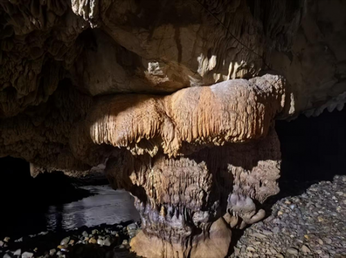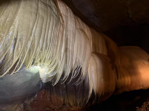 我们变成了一群用脚趾阅读的盲人,在凹凸不平的史书上深一脚浅一脚。石幔是凝固的瀑布,石笋是企图触摸天空的野心,而石柱是天地终于完成的第一次握手。这些石头在生长,以远比爱情缓慢的速度。我们短暂的生命,甚至不足以见证它们一次完整的呼吸。